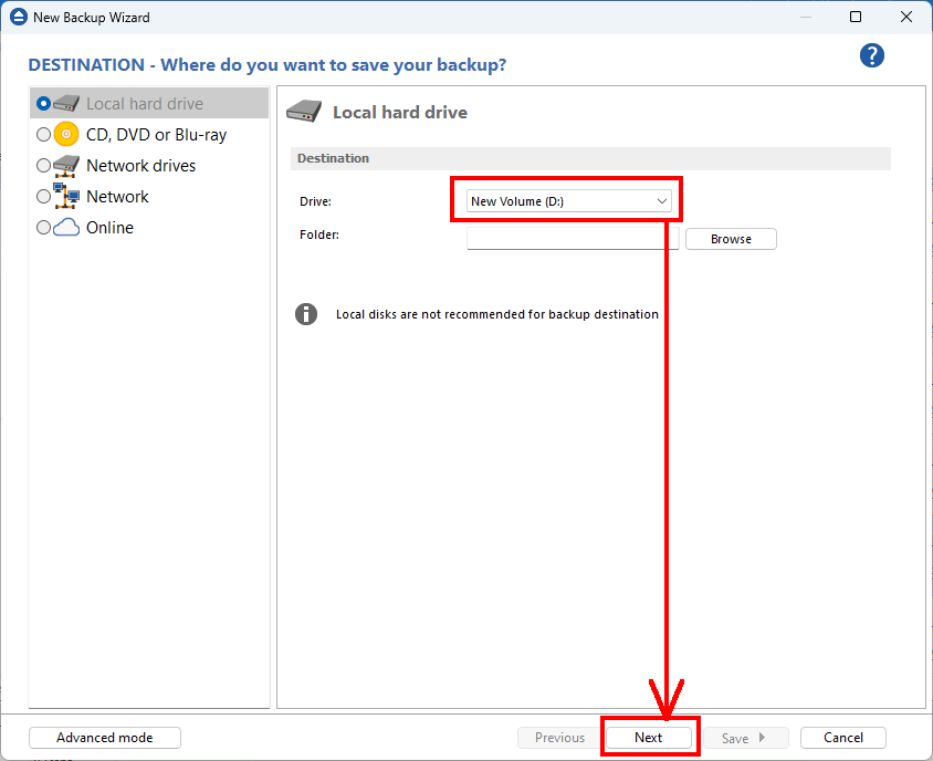 - On the Where do you want to save the backup? page, select the backup destination you want to use. In this article we will use a Removable USB drive. Press Next