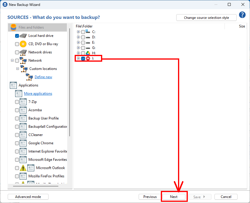 - On the What do you want to backup page, add the backup sources from MEGA, by using the local mapped drive. Press Next