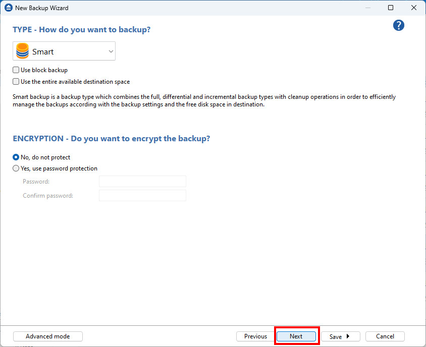 - On the How do you want to backup page, you can choose the backup type and the encryption.