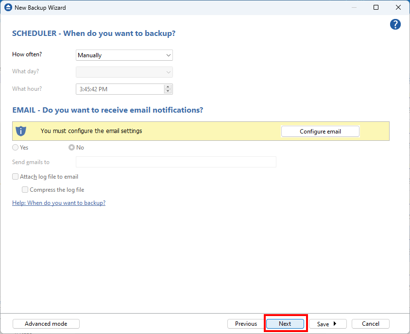 - On the When do you want to backup page, you can set the backup job to automatically run on the specified time and days. Press Next.