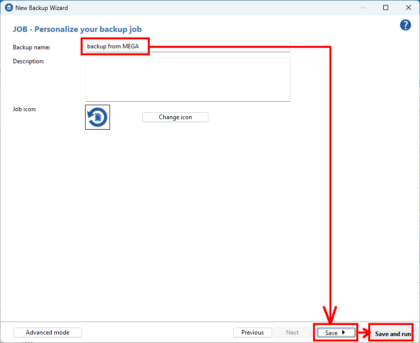 - On the Personalize your backup job page, enter a name for the backup in the Backup name field. Then press Save -> Save and run