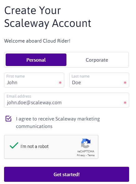 - Go to https://console.scaleway.com/register