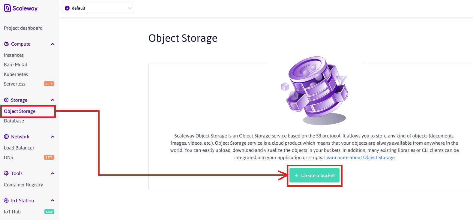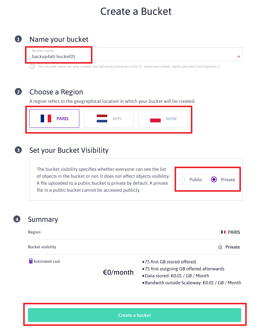- After the account was setup, please go to https://console.scaleway.com/object-storage to create your first bucket.