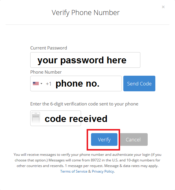 - You will be asked to confirm your phone, enter the phone number and then the confirmation code received. Press Verify